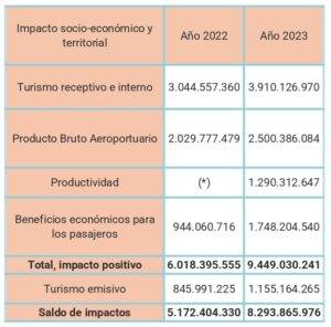 Utilizando la metodología de IATA (Asociación Internacional de Transporte Aéreo), se calculó que el aporte de Aerolíneas al PBI argentino en 2023 fue de 8.294 millones de dólares.