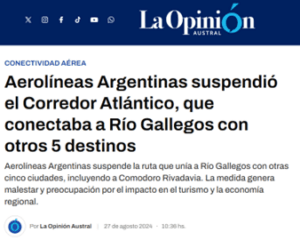 - Más recientemente, se anunció la suspensión de los vuelos Córdoba-Trelew, Rosario-Calafate, Rosario-Neuquén y Salta-Neuquén.