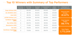 Aerolíneas Argentinas se encuentra, además, en el top 10 de empresas con mejor rendimiento en América Latina, según el Informe de Cirium, una consultora reconocida en materia de datos de aviación, “The on-time performance review 2023”: