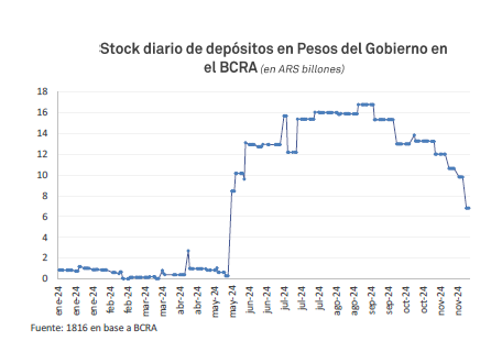 La duda es qué ocurrirá cuando esos depósitos se terminen. “En 2025, no habrá blanqueo (0,1% del PBI recaudado este año), ni Régimen Especial de Bienes Personales (0,2% del PBI) ni Moratoria (0,2% del PBI, aunque se seguirán cobrando cuotas de quienes ingresaron), ni impuesto PAIS (1,1% del PBI)”, planteó 1816. “Tampoco pareciera quedar demasiado espacio para seguir ajustando el gasto en obra pública o en las transferencias discrecionales a provincias, rubros que cayeron casi 80% y 70% en términos reales este año, respectivamente”, continuó. “La determinación de Milei con el superávit fiscal se enfrentará a nuevos escollos en los próximos meses”, advirtió.