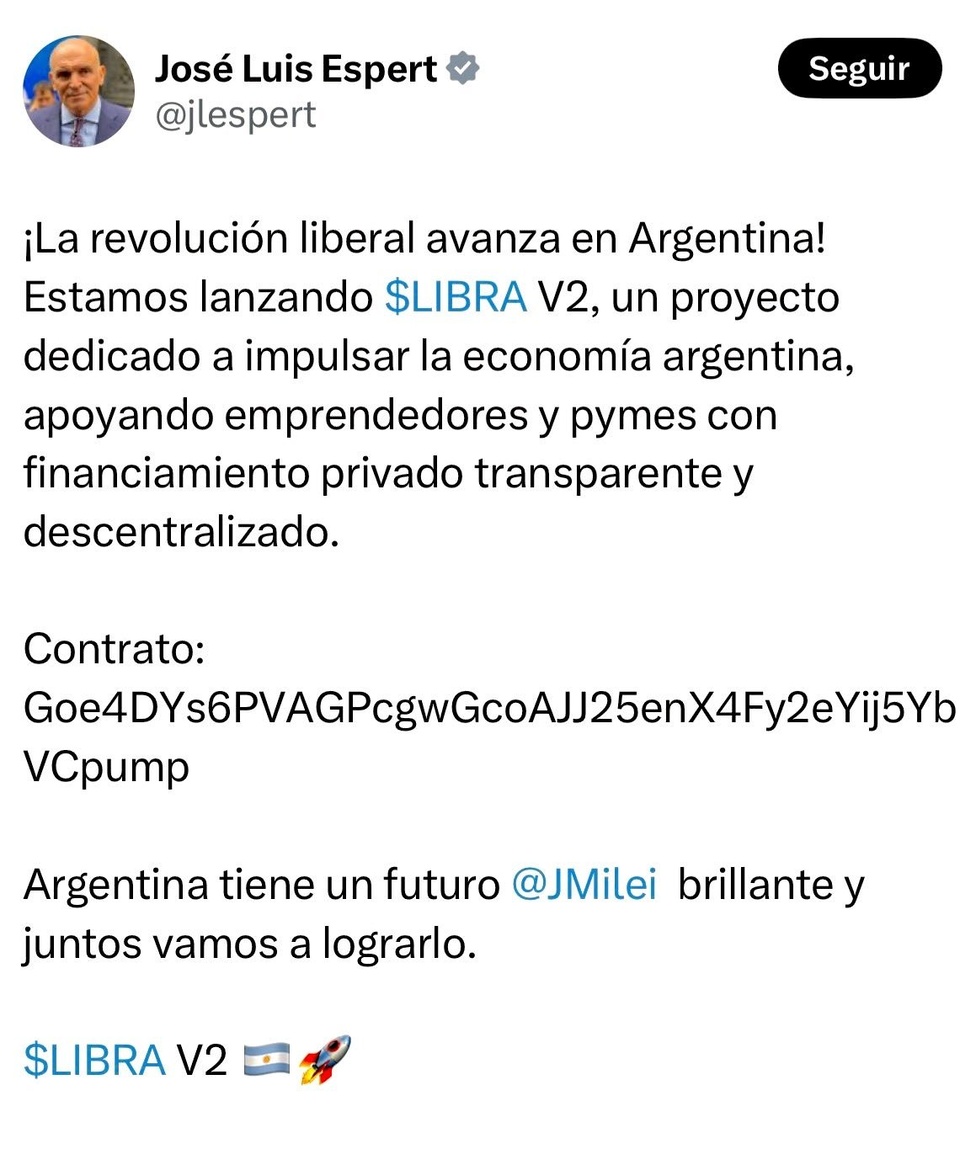 "¡La revolución liberal avanza en Argentina! Estamos lanzando $LIBRA V2, un proyecto dedicado a impulsar la economía argentina, apoyando emprendedores y pymes con financiamiento privado transparente y descentralizado", decía el mensaje publicado en la cuenta de Espert, que, al igual que con el escándalo de Javier Milei, compartía el código del contrato para adquirir el token. Una hora duró la publicación.