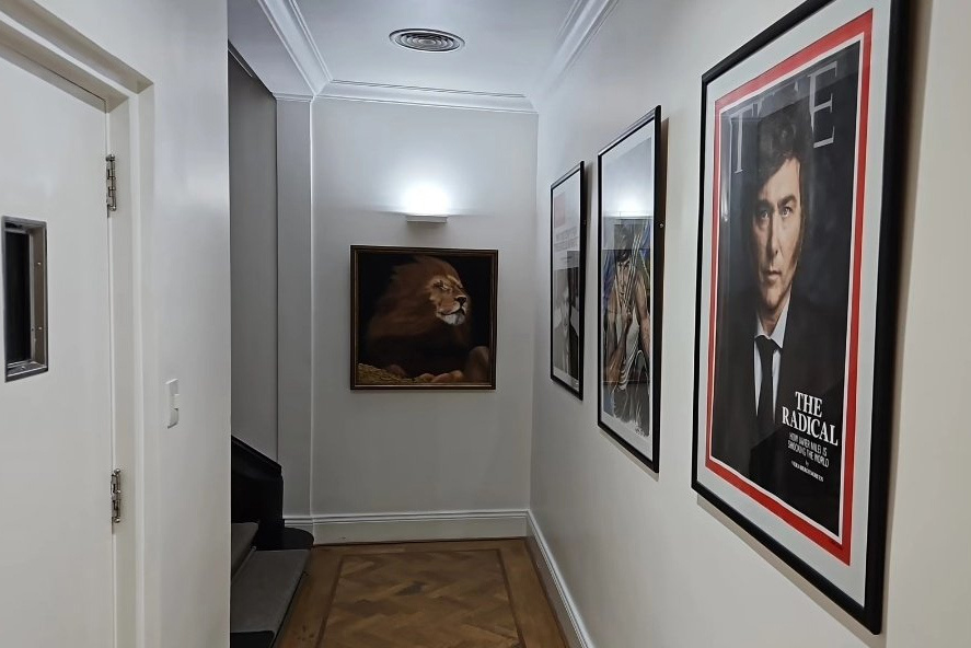 En las últimas horas circularon por la red social dos fotos de la quinta presidencial de Olivos, con el particular gusto de Milei por decorar las paredes con imágenes alusivas a su persona. Una forma de manifestar culto a la personalidad puertas adentro de la residencial oficial.