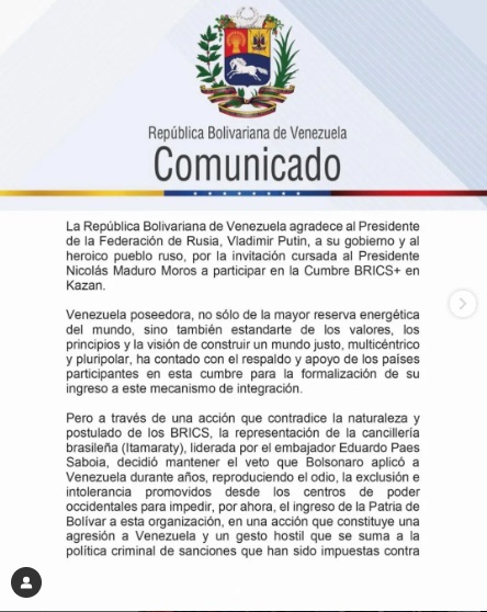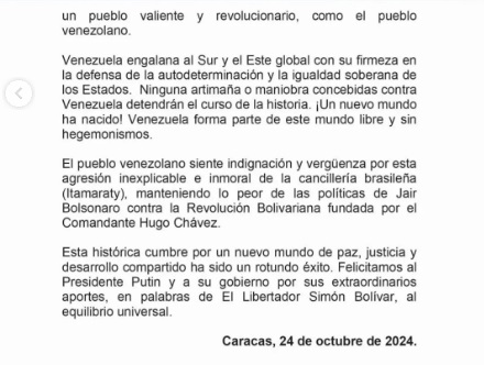 El Ejecutivo de Nicolás Maduro aseguró que contaba con "el respaldo y apoyo de los países participantes en esta cumbre, celebrada en Rusia entre el 22 y el 24 de octubre, para la formalización de su ingreso a este mecanismo de integración". Pero, continúa el texto, "a través de una acción que contradice la naturaleza y postulados de los BRICS, la representación de la Cancillería brasileña decidió mantener el veto que (el expresidente de Brasil Jair) Bolsonaro (2019-2022) aplicó a Venezuela durante años".