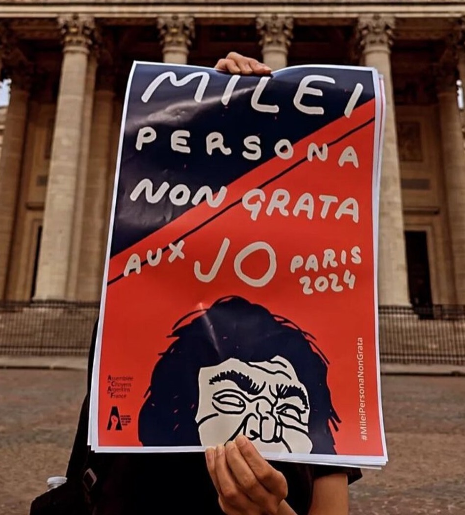 Lo cierto que, incluso antes de su llegada al país galo, comenzaron a verse afiches en contra de Milei distribuidos en diversos puntos estratégicos de París adjudicados al denominado Colectivo Argentina en Lucha. Con la leyenda “Milei persona non grata”, los carteles fueron colocados en lugares de fácil acceso y alta concurrencia pública, como kioscos y puestos de diarios y revistas.