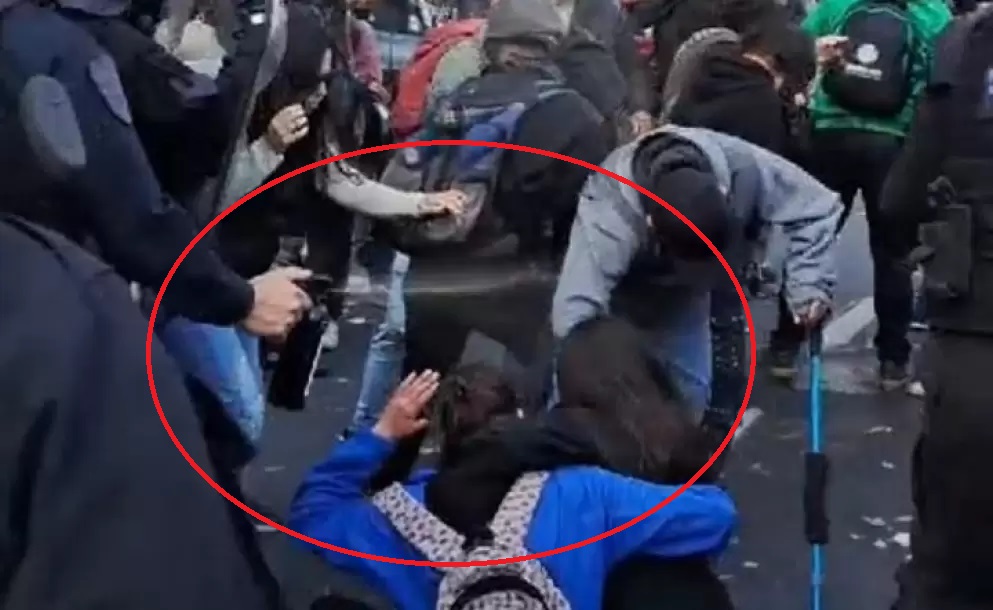 “Hay una nena, hay una nena”, gritaban los manifestantes, sin embargo la tropa avanzó igual rociando gas pimienta sobre las personas que buscaban preservar a la mamá y su hija. Los policías siguieron avanzando en bloque hasta que uno de ellos se paró detrás de la mujer y la niña en el asfalto y les tiró a ambas, el chorro dio sobre gas la cabeza y la ropa de la mujer, y de lleno en el rostro de la criatura.