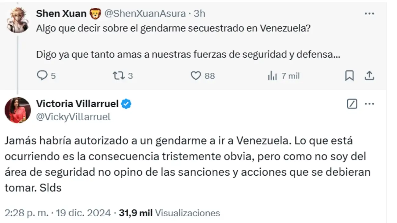 Consultada en la red social X sobre el hecho, la titular del Senado respondió: “Jamás habría autorizado a un gendarme a ir a Venezuela. Lo que está ocurriendo es la consecuencia tristemente obvia, pero como no soy del área de seguridad no opino de las sanciones y acciones que se debieran tomar. Slds”.
